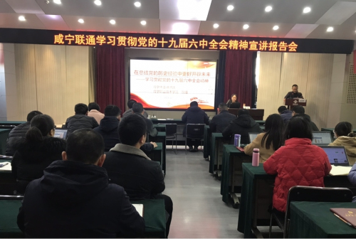为全面深入学习领会党的十九届六中全会精神,根据市委深入开展全会精神宣传活动安排,在市政府国资委的统一部署下,12月22日,咸宁联通邀请到公司教研室主任、副教授陈娟为全体党员同志作十九届六中全会精神专题宣讲,宣讲会在咸宁联通十楼会议室举行,公司党委委员、副总经理周建均同志主持会议,党委中心组成员、本部正副职干部、党员同志共计42人参会听取了全会精神宣讲。